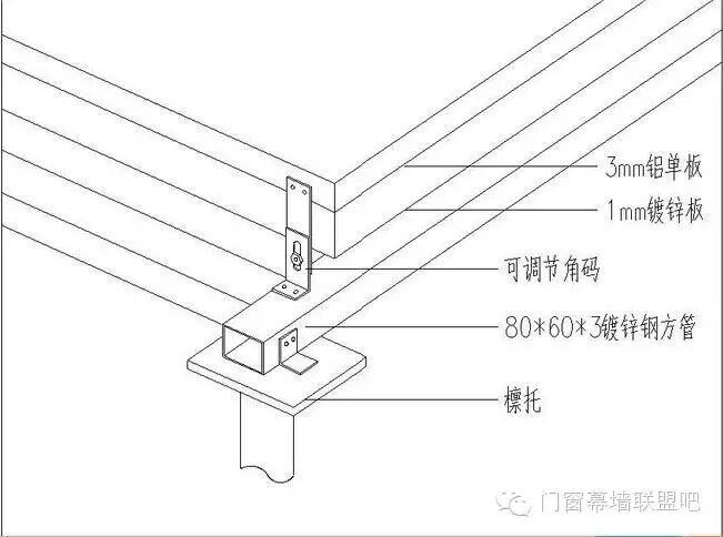 c、钢骨架的安装:主框采用80*60*3镀锌方钢管,确定基准面测量误差,调整横向、竖向、间距误差,焊接框架,焊接要牢固焊缝饱满,焊缝应打磨平整光滑;与连接件连接要牢固。
