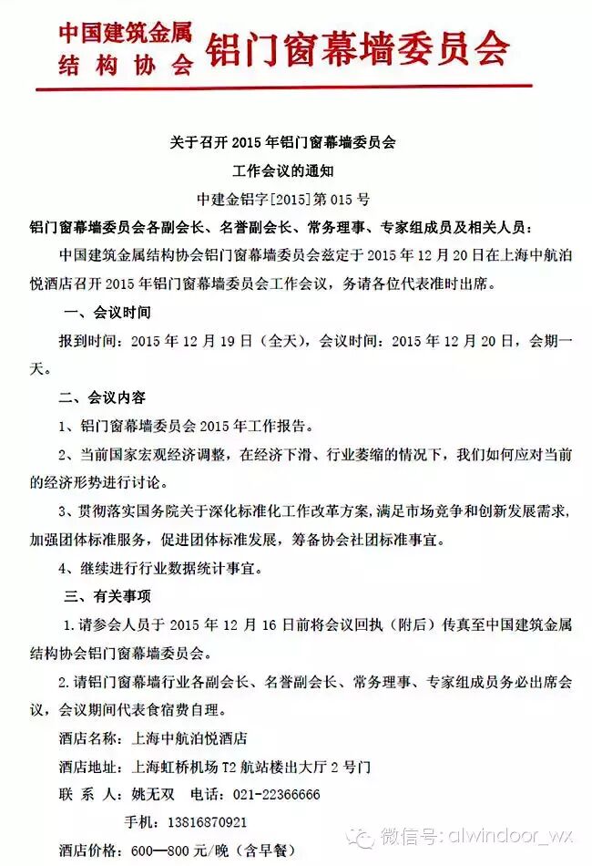 中国建筑金属结构协会铝门窗幕墙委员会兹定于2015年12月20日在上海中航泊悦酒店召开2015年铝门窗幕墙委员会工作会议,务请各位代表准时出席。
