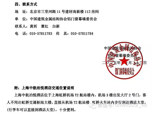 1.请参会人员于2015年12月16日前将会议回执(附后)传真至中国建筑金属结构协会铝门窗幕墙委员会。